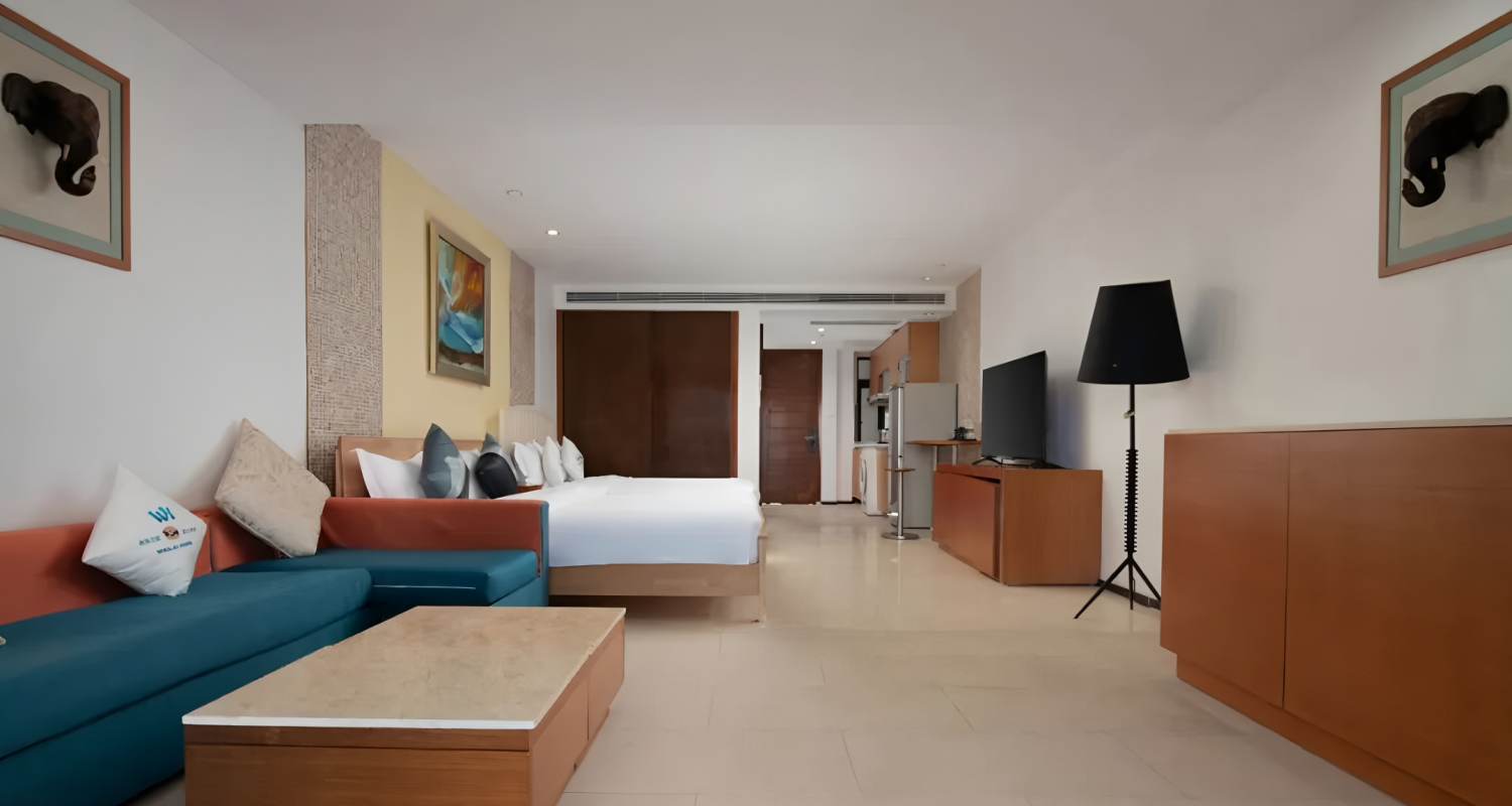 客房布局:有观景阳台、有独立卫生间、无客厅,有简易厨房。